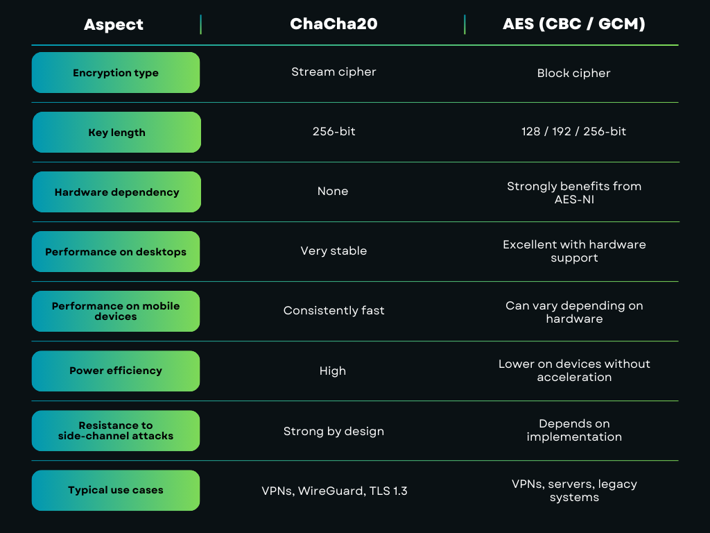 This comparison shows why ChaCha20 is getting more attention in today's VPN setups. AES is still a good, reliable option, but it works best when hardware helps it run faster - and not every device has that.