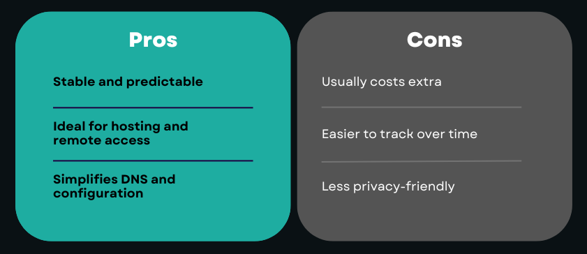 Whether an IP is static or dynamic affects stability, accessibility, and privacy. For everyday browsing, dynamic IPs are usually sufficient. For infrastructure and remote access, static IPs are often required.