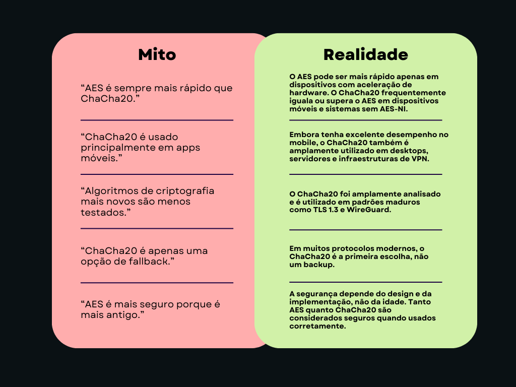 Na prática, a diferença não está em qual algoritmo é “mais seguro” — ambos são considerados seguros quando bem implementados. A distinção real está em como se comportam fora de condições ideais. O ChaCha20 oferece desempenho previsível em diferentes plataformas, enquanto o AES pode variar conforme o hardware.
