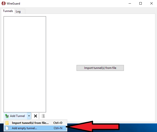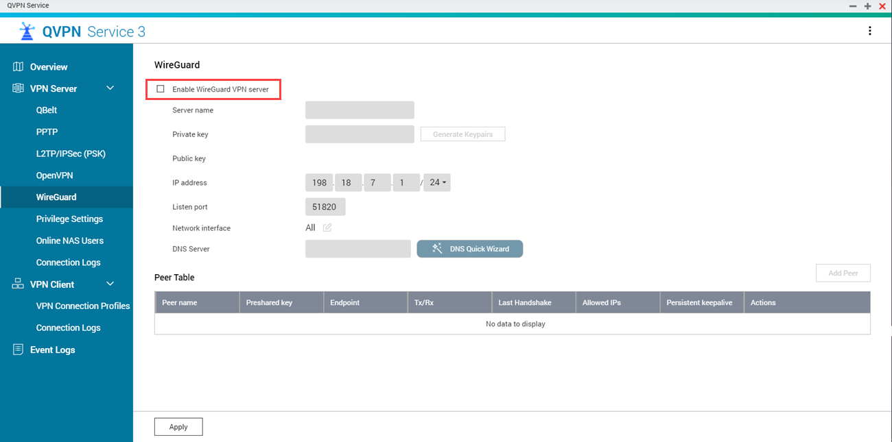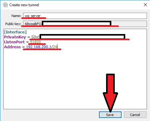 Aqui você deve inserir o nome da conexão de rede e a chave pública do servidor WireGuard (necessária para configurar o lado do cliente).