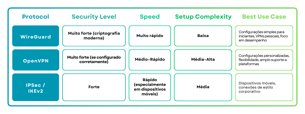 Também vale lembrar que serviços de VPN comerciais normalmente suportam vários protocolos e selecionam automaticamente a melhor opção — algo que você precisará gerenciar manualmente em uma VPN DIY.