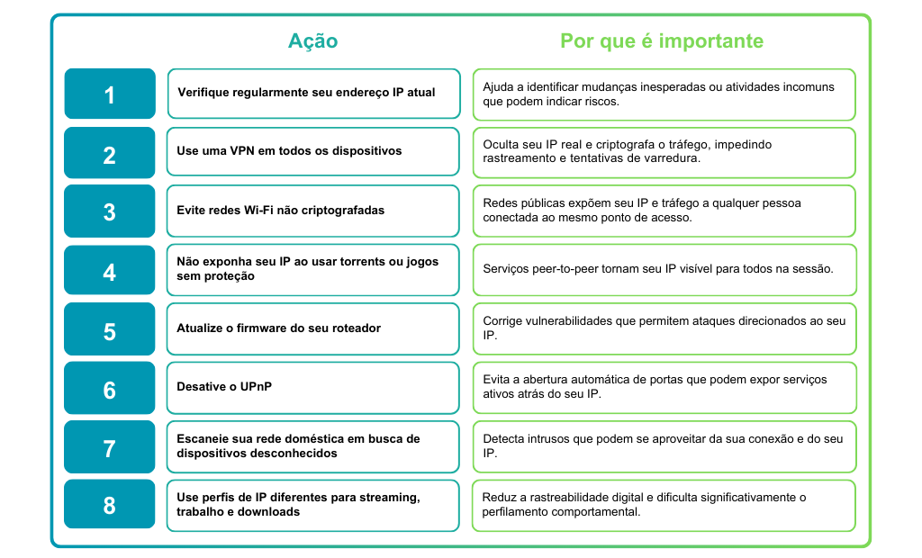 - Limite informações públicas online. Evite compartilhar dados pessoais que possam ser associados ao seu IP.