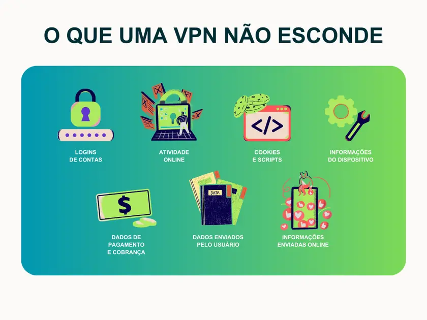 A VPN oculta seu endereço IP e criptografa seu tráfego, mas isso não significa que você fique invisível online. Sites ainda podem identificá-lo por cookies, contas em que você está logado, configurações do navegador e muitos outros sinais. Se você fizer login no Google ou Instagram, eles ainda saberão quem é você. - Não protege contra vírus ou golpes