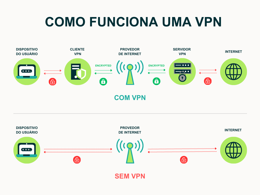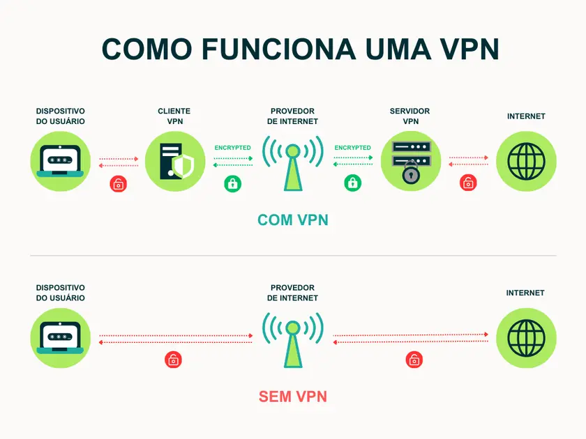 A forma mais simples de entender é: a VPN cria um tipo de túnel privado para sua atividade online. Dentro desse túnel: