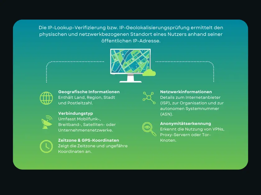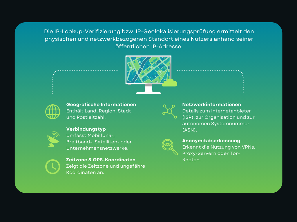 Bei einem IP-Lookup wird die IP-Adresse mit großen öffentlichen und kommerziellen Datenbanken abgeglichen, die Folgendes zuordnen: