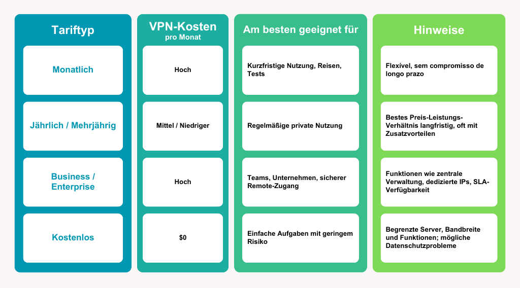 Wenn Sie ein VPN nur gelegentlich benötigen — für Geschäftsreisen, Urlaube oder kurzfristige Projekte — sind monatliche Pläne oft am sinnvollsten, trotz der höheren monatlichen Kosten.