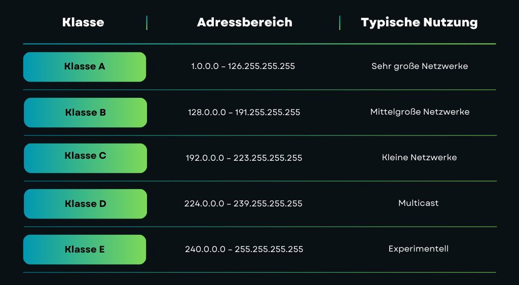 Bevor moderne Methoden zur IP-Zuweisung eingeführt wurden, waren IP-Adressen in Klassen unterteilt. Dieses System, bekannt als klassenbasierte Adressierung (Classful Addressing), wurde entwickelt, um das Routing in den frühen Tagen des Internets zu vereinfachen.