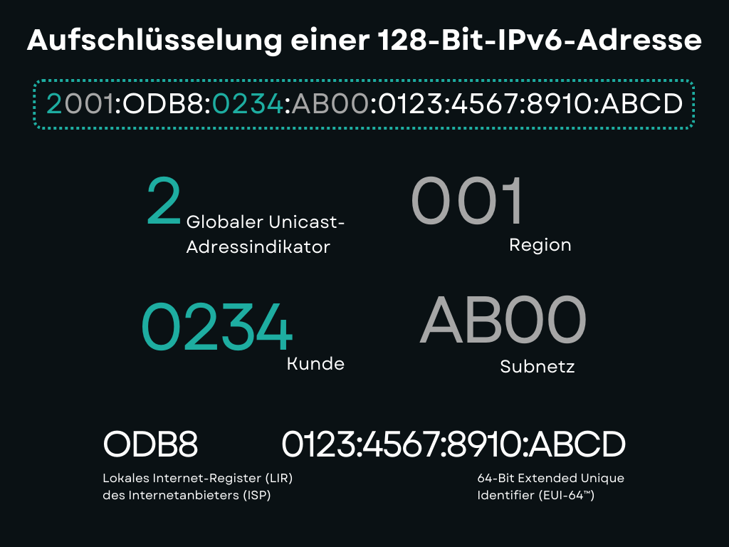 IPv6 wurde eingeführt, um das Problem des Adressmangels zu lösen. Es verwendet ein 128-Bit-Format und wird in hexadezimaler Schreibweise dargestellt, wodurch nahezu unbegrenzte eindeutige Adressen möglich sind.