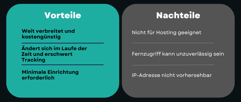 Dies vereinfacht den Betrieb für den Provider und reduziert manuellen Aufwand. Zusätzlich erhöht es die Privatsphäre, da sich die IP-Adresse im Laufe der Zeit ändert.