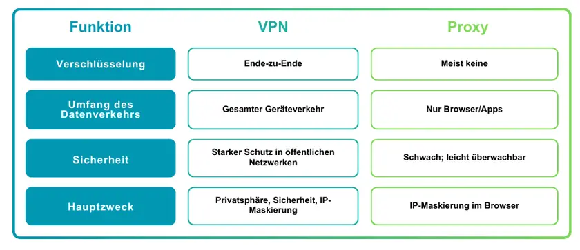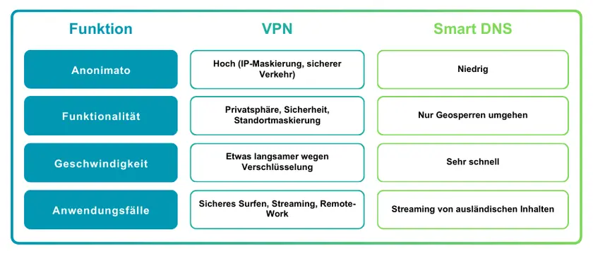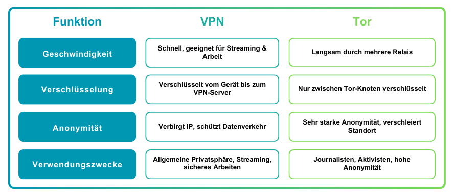 VPNs bieten die ausgewogenste Kombination aus Privatsphäre, Sicherheit und Flexibilität. Proxys sind leichtgewichtig, aber eingeschränkt; Tor bietet maximale Anonymität bei geringer Geschwindigkeit; Smart DNS dient nur zur Standortänderung.
