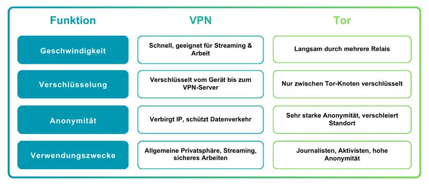 VPNs sind nur eines von mehreren Werkzeugen, die Menschen zur Online-Privatsphäre nutzen. Obwohl alle auf mehr Sicherheit oder Anonymität abzielen, hat jede Methode eigene Stärken und Schwächen. Hier ein kurzer Vergleich.