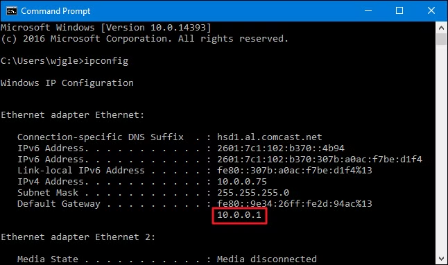 - Die Zeile Default Gateway zeigt die IP-Adresse Ihres Routers an.