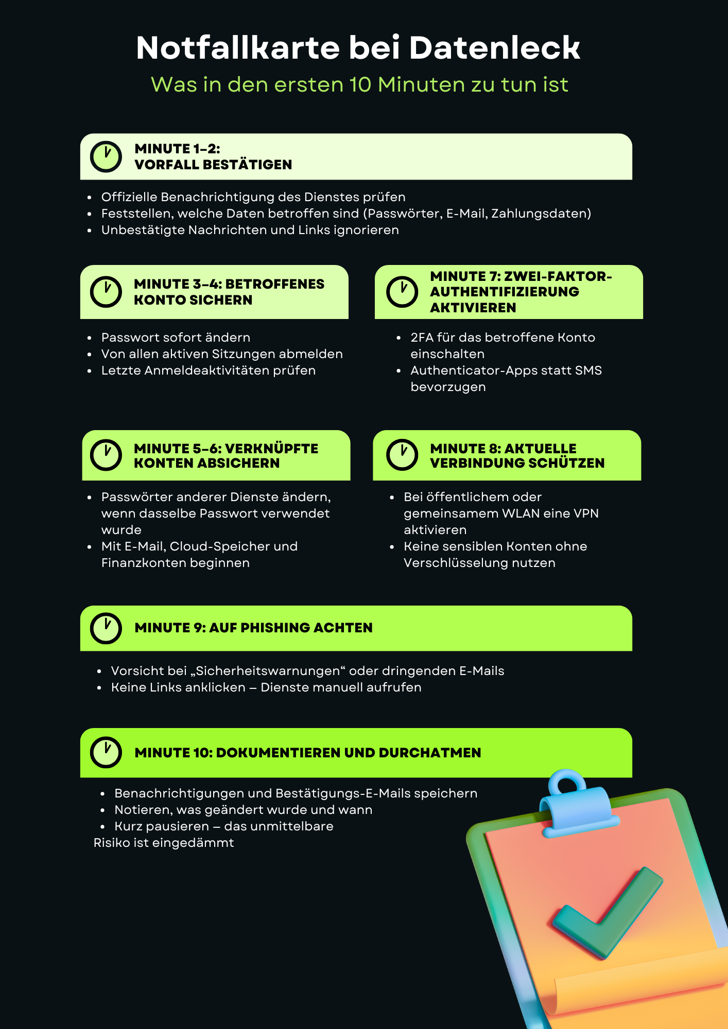 Ein Datenleck fühlt sich beängstigend an, aber es ist kein Weltuntergang. Mit Ruhe und den richtigen Schritten kannst du Schäden begrenzen und deine Konten schützen.