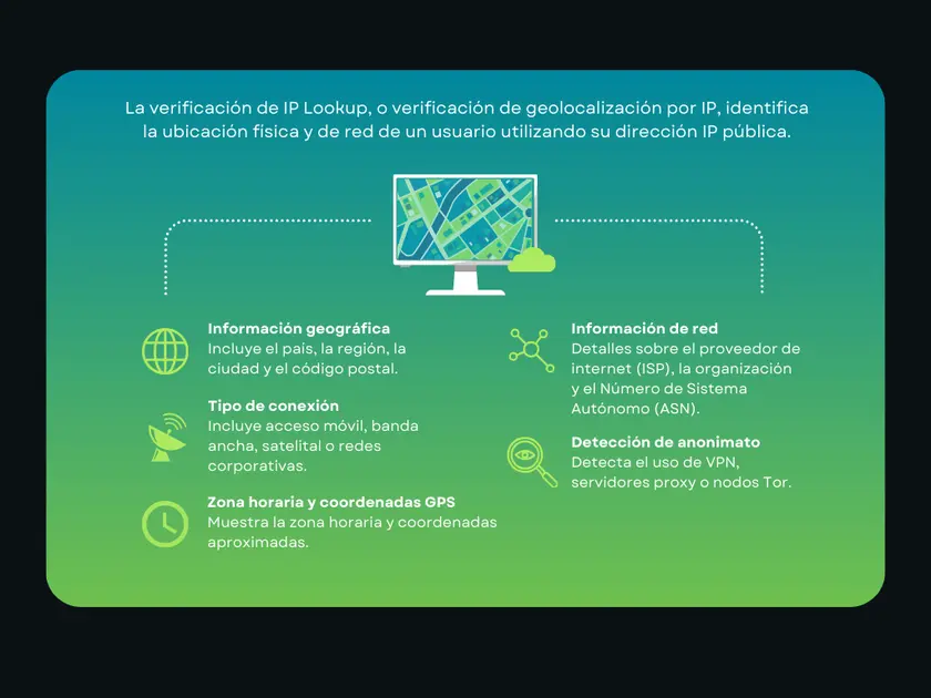 Cuando realizas un IP lookup, la herramienta compara la dirección IP con grandes bases de datos públicas y comerciales que asignan:
