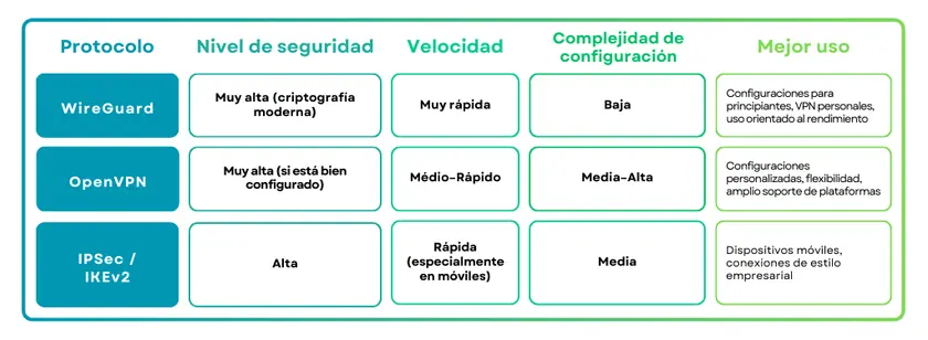 También conviene tener en cuenta que los servicios de VPN comerciales suelen admitir varios protocolos y elegir automáticamente la mejor opción — algo que en una VPN DIY tendrás que gestionar manualmente.