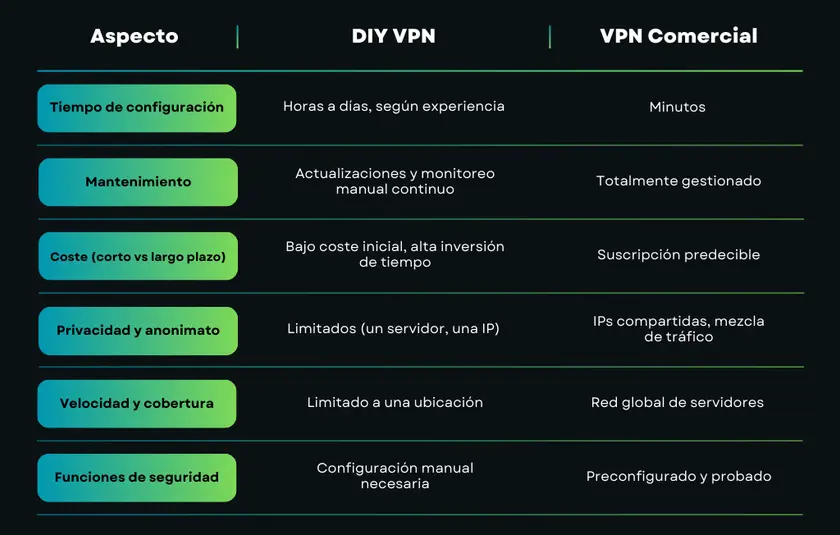 Esto no hace obsoletas las VPN DIY, pero explica por qué muchos empiezan con una VPN personal y luego cambian a una solución comercial.