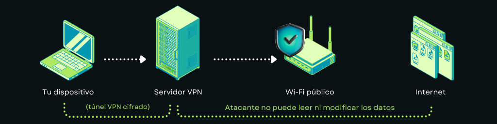 Una VPN cifra tus datos antes de que pasen por la red local. Incluso si el Wi-Fi no es seguro, tu información sigue protegida. Los atacantes pueden ver que hay actividad, pero no pueden leer ni modificar el contenido.