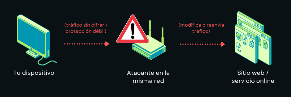 Tu dispositivo cree que está hablando directamente con el sitio web, pero el tráfico pasa silenciosamente por el atacante, que puede observarlo o manipularlo.