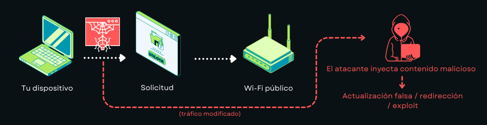 Los atacantes modifican el tráfico de la red para insertar contenido malicioso o redirigir a los usuarios a servidores comprometidos.