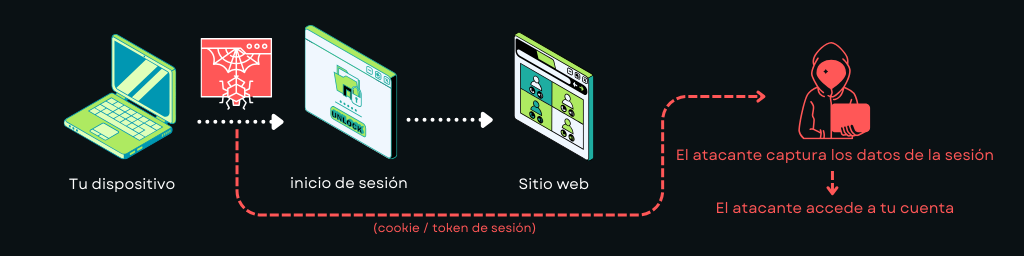 El secuestro de sesión ocurre cuando alguien roba tus datos de sesión, como cookies o tokens. Con eso puede acceder a tus cuentas sin necesidad de tu contraseña, incluso después de haber iniciado sesión.