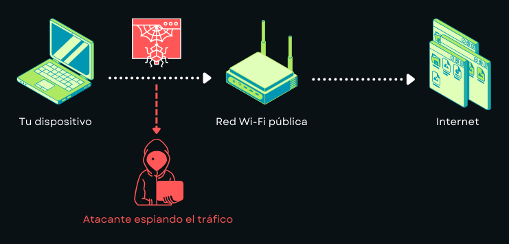 Cuando usas Wi-Fi público, los atacantes pueden aprovechar vulnerabilidades de la red o técnicas como ARP spoofing para interceptar tus datos sin que te des cuenta.