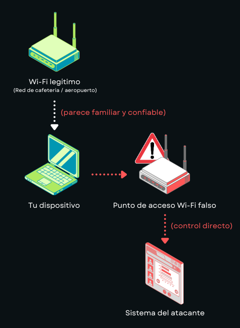Crees que te conectas a una red segura, pero en realidad todo el tráfico va directamente al atacante.