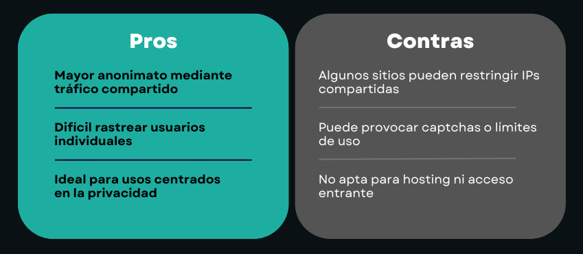 - Para mayor anonimato y menor rastreo, los pools de IP compartidas ofrecen ventajas claras.