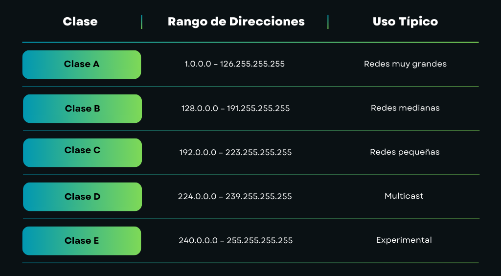 Cada clase definía qué parte de la dirección IP identificaba la red y qué parte identificaba al host dentro de esa red.