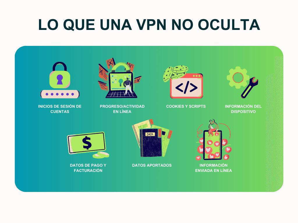 La VPN oculta tu IP y cifra tu tráfico, pero no te hace invisible en internet. Los sitios aún pueden reconocerte mediante cookies, cuentas iniciadas, configuración del navegador y otros indicadores. Si inicias sesión en Google o Instagram, ellos saben quién eres. - No te protege de virus o estafas