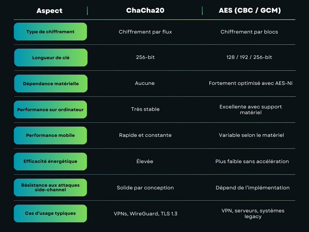 C’est pourquoi ChaCha20 attire de plus en plus l’attention dans les infrastructures VPN modernes. AES reste une solution solide, mais dépend davantage du matériel. ChaCha20, lui, fournit des résultats constants sur presque tous les appareils.