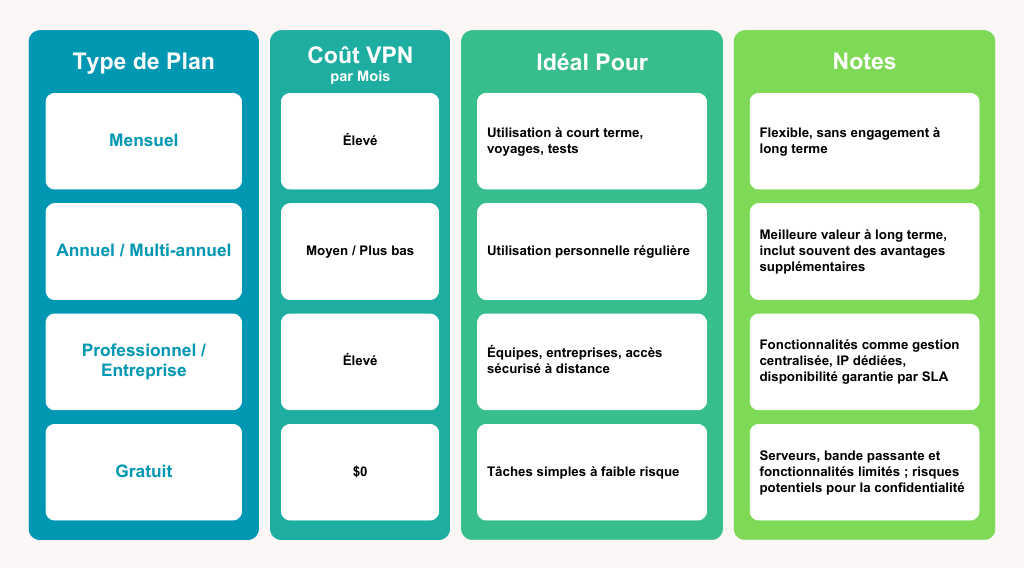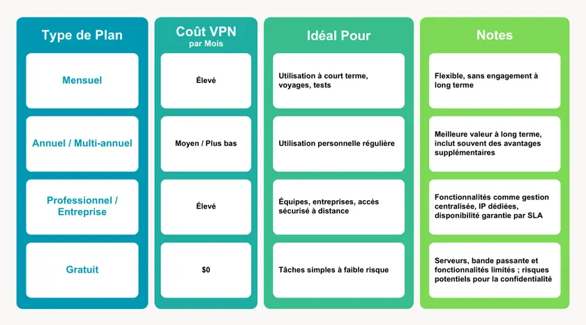 Si vous utilisez un VPN ponctuellement — voyages d'affaires, vacances ou projets temporaires — les plans mensuels sont les plus pratiques, malgré un coût mensuel plus élevé.