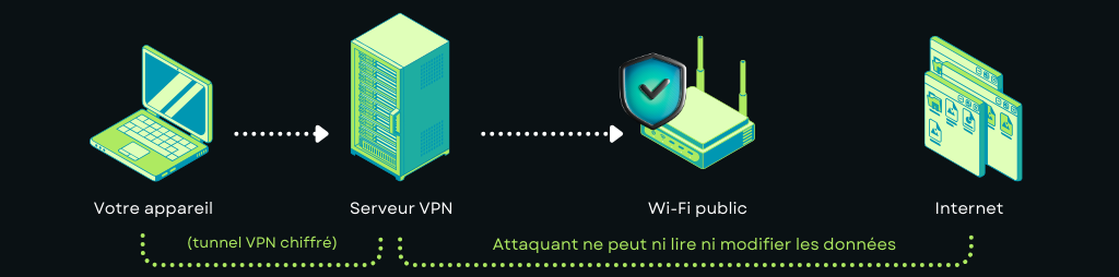 Un VPN chiffre vos données avant qu’elles ne passent par le réseau local. Même si le Wi-Fi est compromis, vos informations restent protégées. Les attaquants peuvent voir qu’il y a du trafic, mais ils ne peuvent ni le lire ni le modifier.