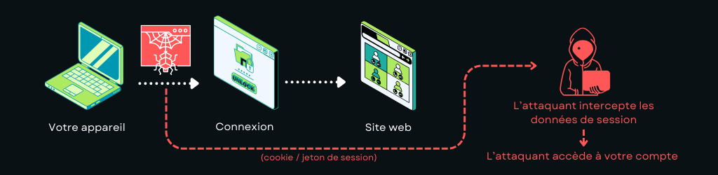 Le détournement de session se produit lorsqu’un attaquant vole vos informations de session, comme des cookies ou des jetons. Il peut alors accéder à vos comptes sans mot de passe, même après votre connexion.
