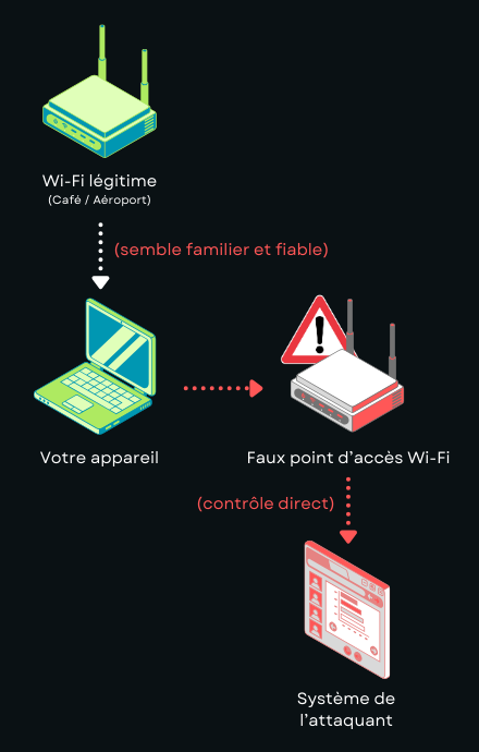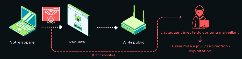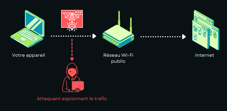 Lorsque vous utilisez un Wi-Fi public, un attaquant peut exploiter des failles du réseau ou utiliser des techniques comme l’ARP spoofing pour intercepter vos données sans que vous vous en rendiez compte.