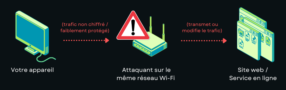 Votre appareil pense communiquer directement avec le site web, alors que le trafic passe discrètement par l’attaquant, qui peut l’observer ou le manipuler.