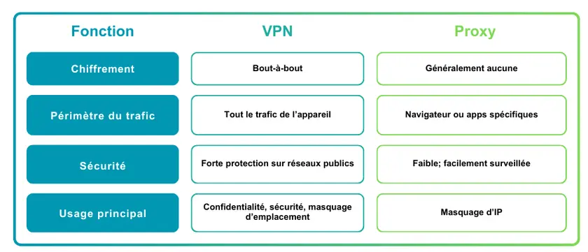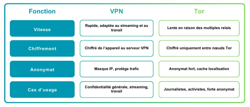 Les VPN ne sont qu’un des nombreux outils permettant de protéger la vie privée en ligne. Bien qu’ils poursuivent tous le même objectif, chacun présente des forces et limites uniques. Voici une comparaison rapide.