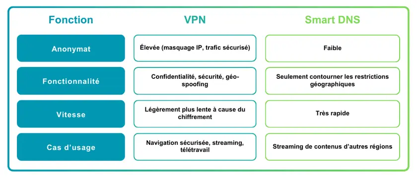 Les proxys sont simples mais limités; Tor assure un anonymat maximal au détriment de la vitesse; Smart DNS se concentre uniquement sur le changement de localisation.