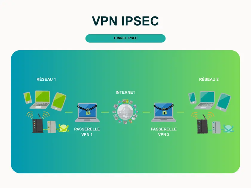 IPSec (Internet Protocol Security) est l’un des protocoles VPN les plus utilisés, conçu pour sécuriser les données à la couche réseau du modèle OSI. Il crée un tunnel chiffré entre appareils et serveurs, garantissant confidentialité, intégrité et authentification.