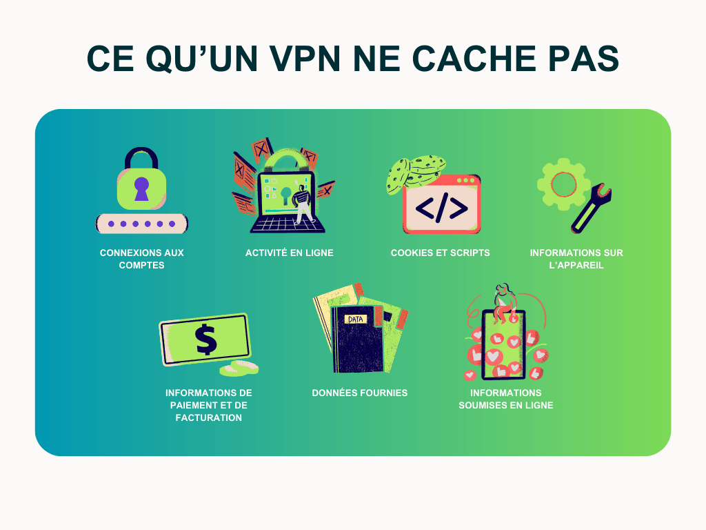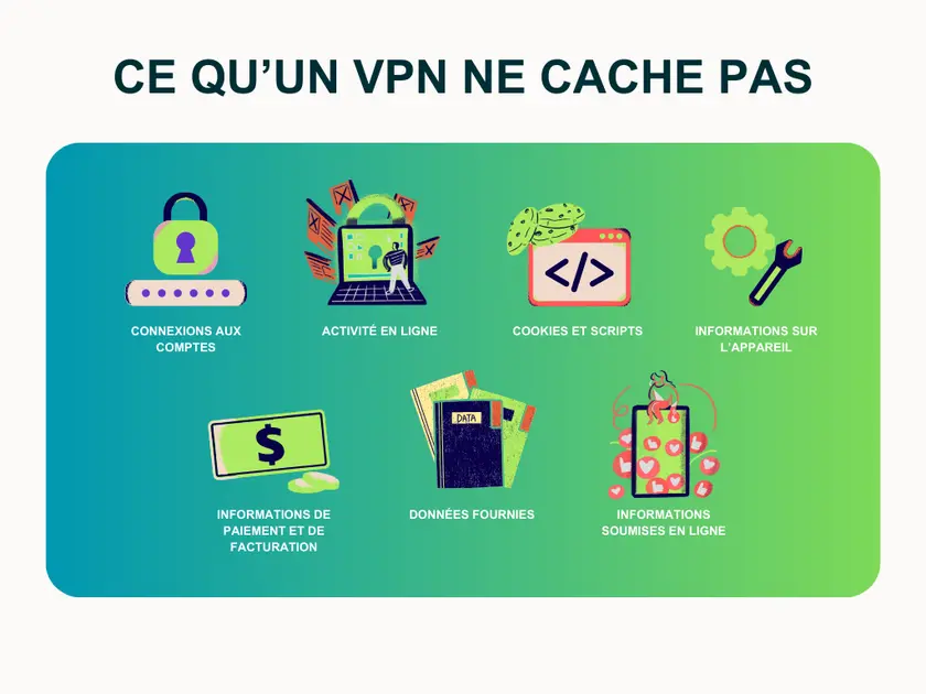 Une VPN masque votre IP et chiffre le trafic, mais vous n’êtes pas invisible. Les sites peuvent encore vous identifier via cookies, comptes connectés, paramètres du navigateur et autres signaux. Google ou Instagram savent toujours que c’est vous. - Ne protège pas contre les virus ou les arnaques