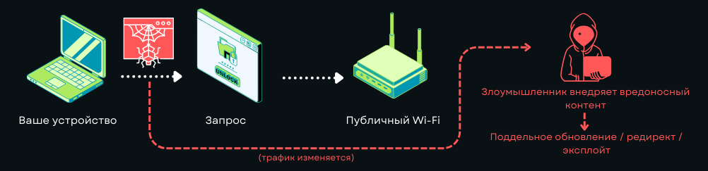 Злоумышленники изменяют сетевой трафик, вставляя вредоносный контент или направляя пользователей на скомпрометированные серверы.