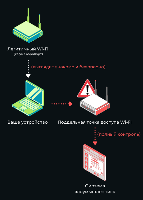 В отличие от домашней или рабочей сети, публичный Wi-Fi создаётся прежде всего для быстрого доступа, а не для безопасности. Подключиться может любой, кто находится рядом. Контроля над тем, кто в сети и как передаются данные, почти нет. Поэтому такие сети становятся удобной целью для злоумышленников.