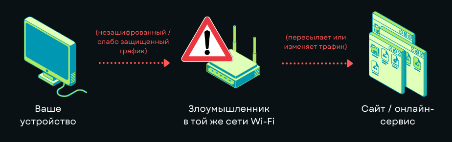 Ваше устройство думает, что общается напрямую с сайтом, но на самом деле данные незаметно проходят через атакующего, который может их читать или менять.