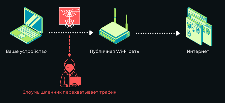 При использовании публичного Wi-Fi злоумышленники могут воспользоваться уязвимостями сети или применять техники вроде ARP-spoofing, чтобы перехватывать ваш трафик - причем вы этого даже не заметите.