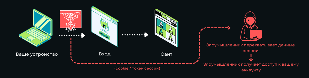 Перехват сессии происходит, когда злоумышленник крадёт данные вашей активной сессии - cookies или токены. Это позволяет ему получить доступ к аккаунтам без пароля, даже если вы уже вошли в систему.