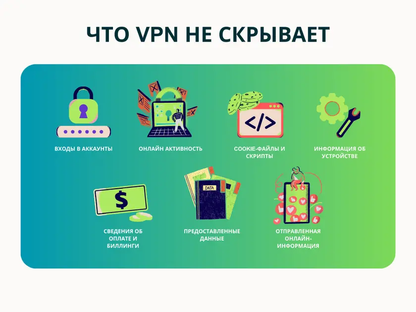 VPN скрывает ваш IP и шифрует трафик, но вы не становитесь невидимым онлайн. Сайты все еще могут распознать вас через cookies, учётные записи, настройки браузера и другие признаки. Если вы вошли в Google или Instagram, они всё равно знают, кто вы. - Не защищает от вирусов или мошенничества